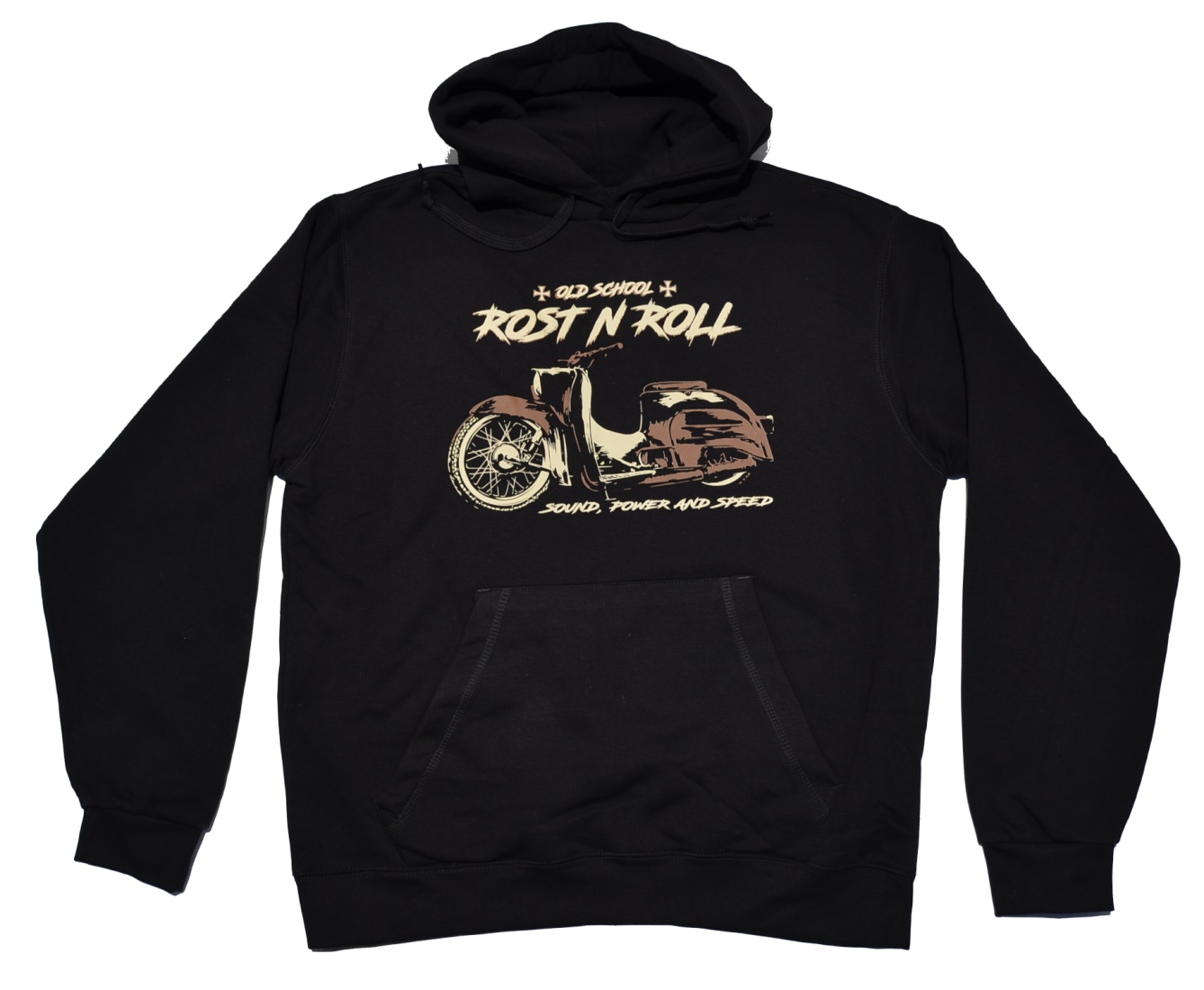 Ostmoped Motiv Kapuzensweatshirt mit großem Frontprint - Old School Rost n Roll Sound, Power and Speed - abgebildet ist eine Simson Schwalbe aus der Vogelserie