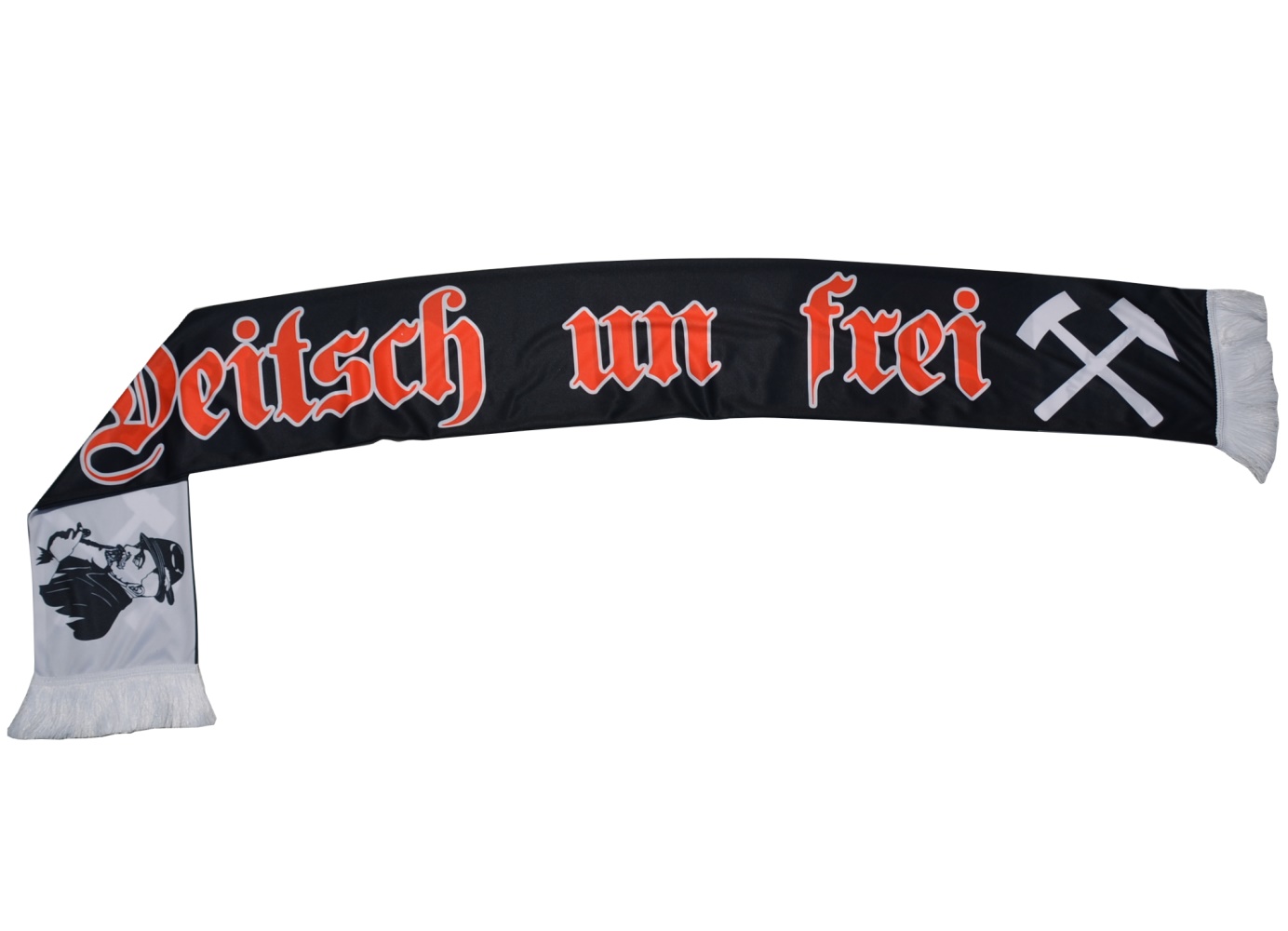 Seidenschal bedruckt mit dem Schriftzug: Deitsch un frei